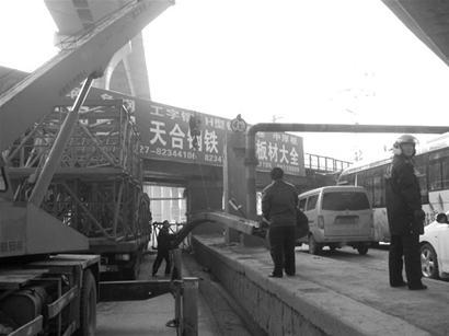 中午12時20分許,記者趕到現場看到,鐵路橋下的限高架脫離原位,被一輛車牌號為豫P22789的大貨車“扛起”,鐵路橋上的6塊人行道步行板及護欄也被貨車裝載的塔吊鋼結構撞損,該貨車則卡在鐵路橋下,進退兩難。此時,該事故已造成解放大道二橋方向車道交通擁堵,1名交警正一邊疏導交通,一邊指揮救援人員用吊車將限高架吊落至地面。